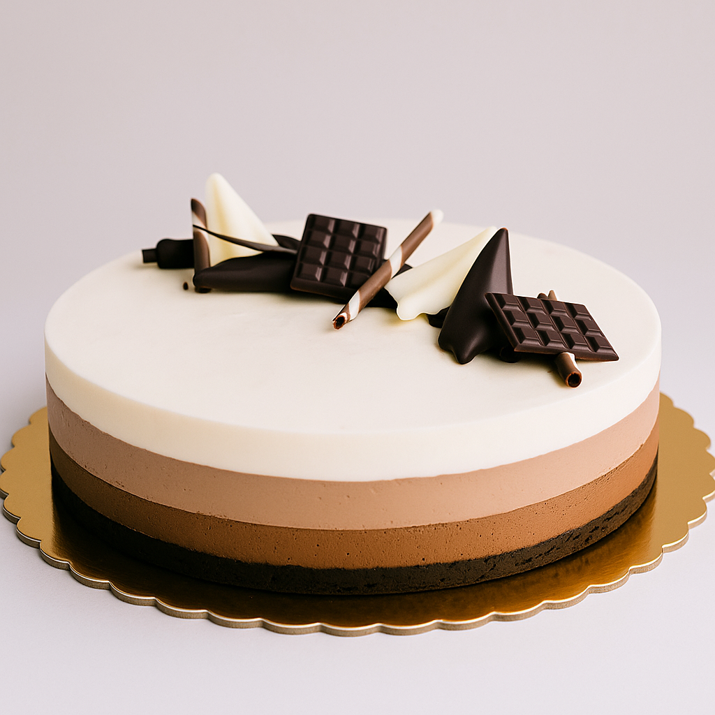 Una elegante y deliciosa combinación de tres capas perfectamente equilibradas: suave mousse de chocolate negro, cremosa mousse de chocolate con leche y delicada mousse de chocolate blanco, todo sobre una base crujiente de galleta de cacao. Decorada con finos trozos de chocolate semiamargo, blanco y con leche, esta tarta es ideal para los amantes del chocolate que buscan una experiencia rica y sofisticada.