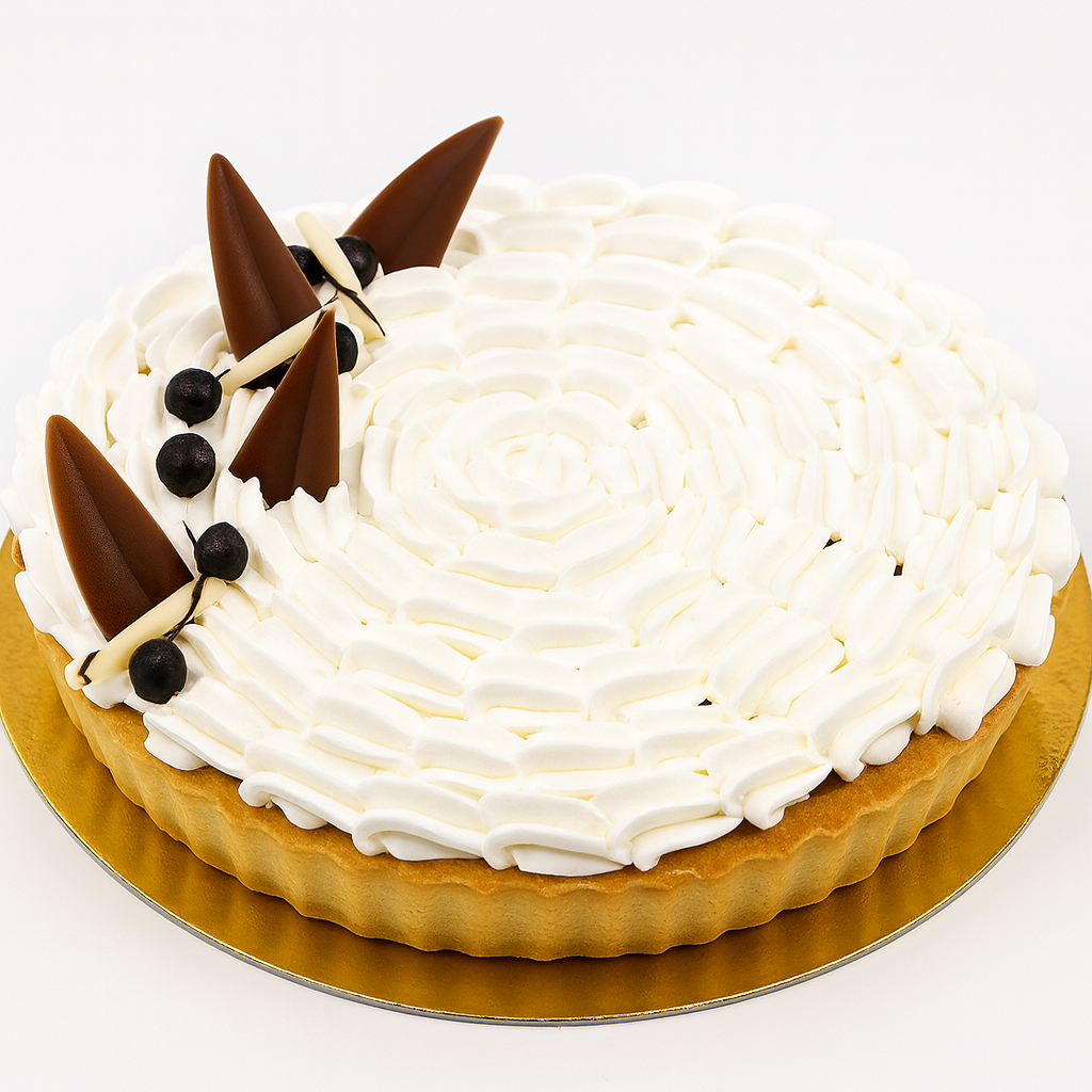 Esta tarta Banoffee consiste en una base crujiente de galletas de vainilla, rellena con dulce de leche suave y trozos de plátano fresco. La tarta está cubierta con nata batida o merengue italiano y adornada con virutas de chocolate o cacao en polvo.